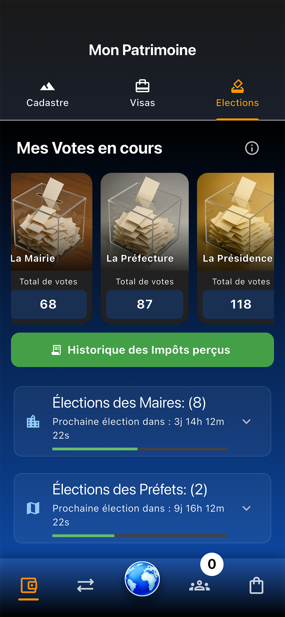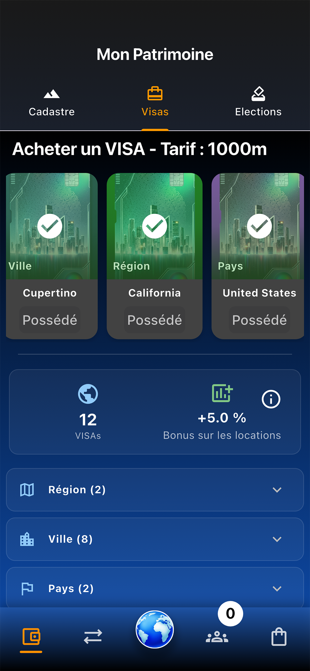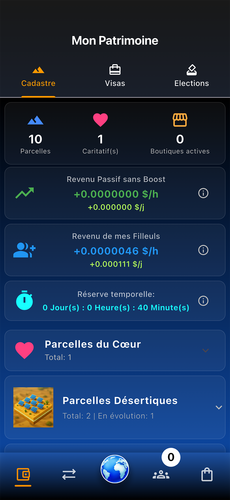 - Geopolitics: Use your m² to vote. Buy Visas to climb the political ladder from City official to National leader and earn rewards from your territory.
